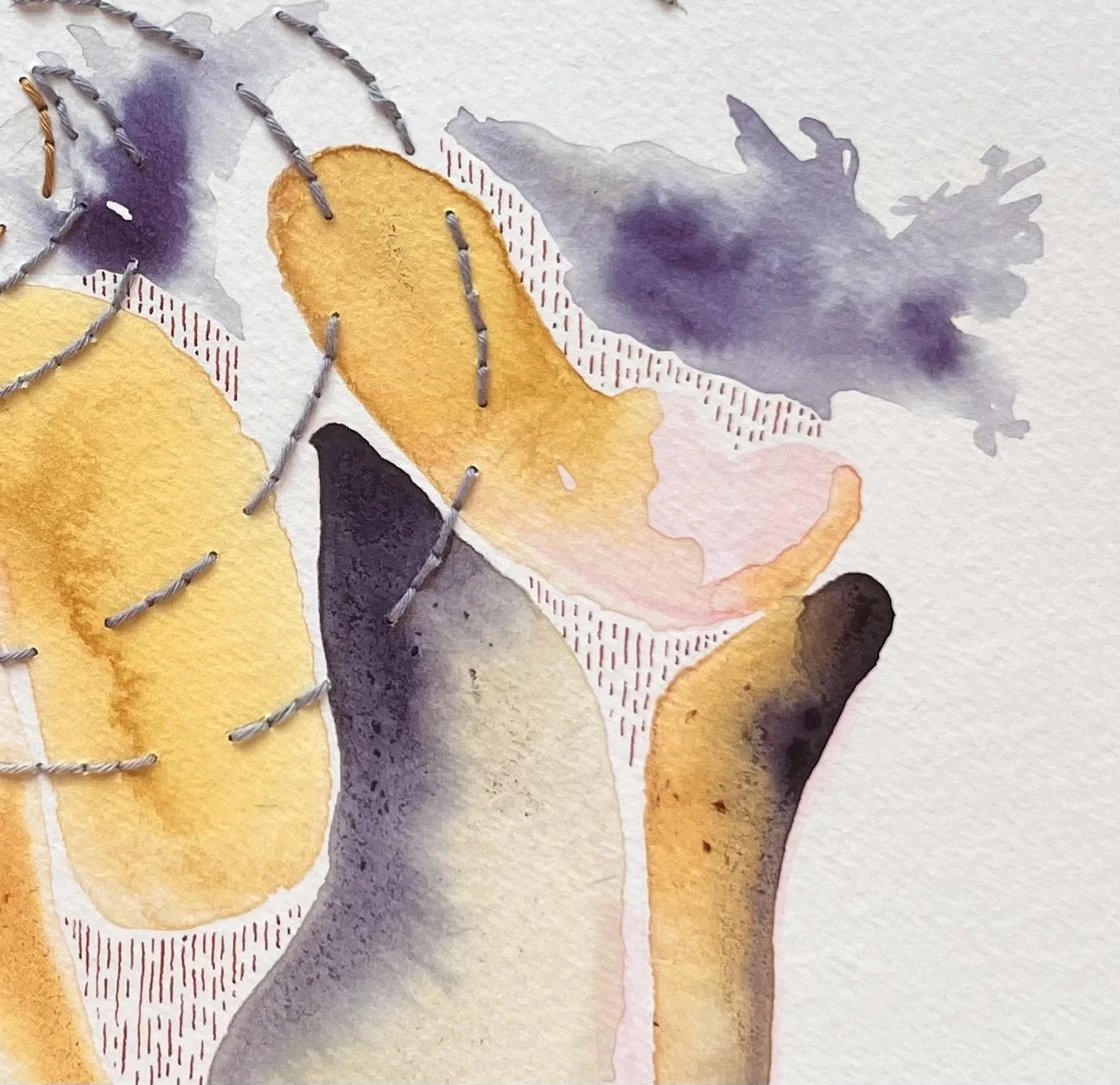 I also integrate embroidery into some of my paintings, using threads dyed with my handmade inks. Needlework has been a part of my life since childhood, though it was a source of frustration when I was young. As an adult, I've reclaimed this practice, bringing with it a sense of meticulousness that was instilled in me by my mother. The backs of my work are as clean as the side you see. This attention to detail, for better or worse, is a part of who I am, and it’s reflected in the intricate embroidery that adds texture and depth to my art.