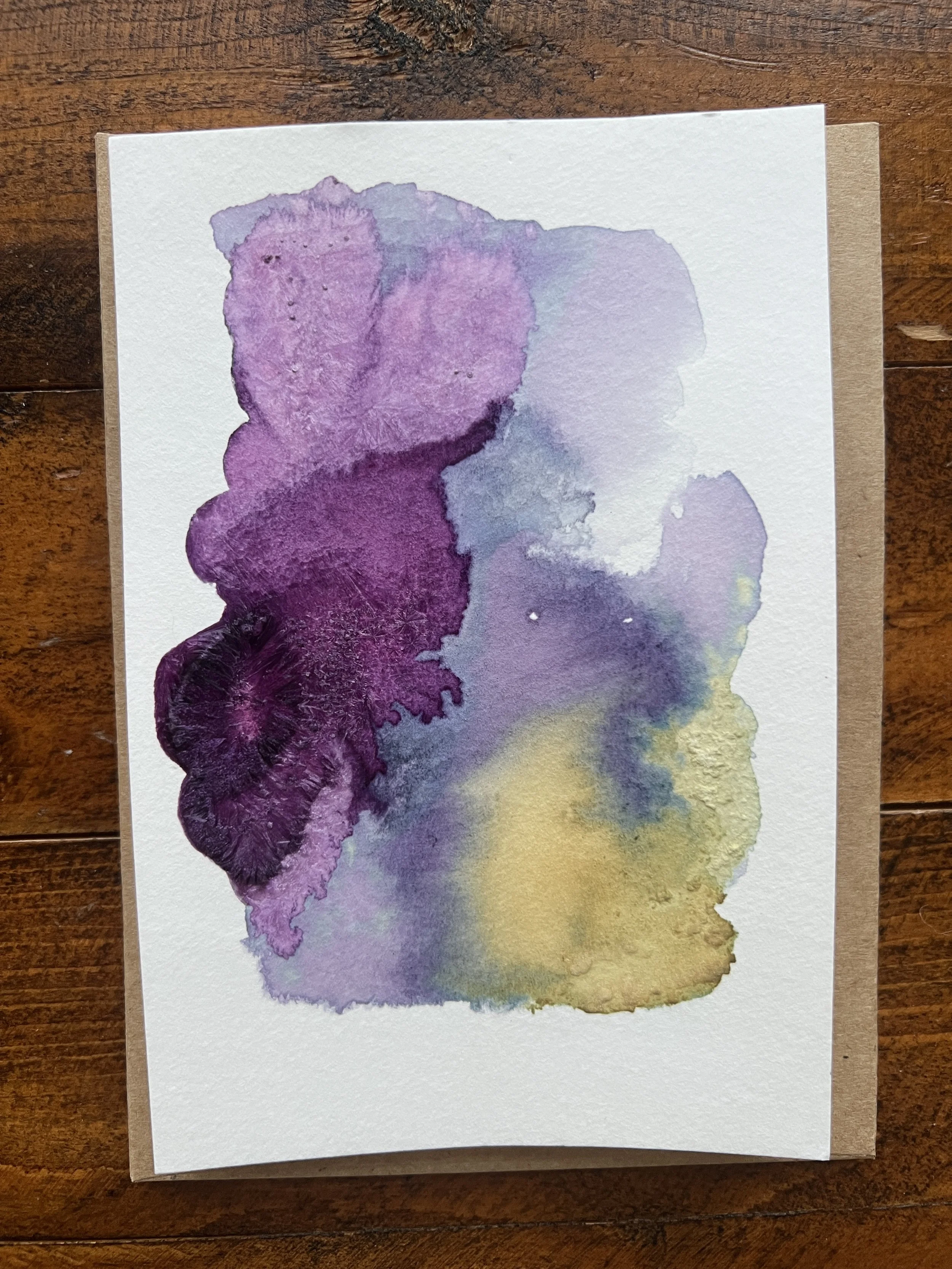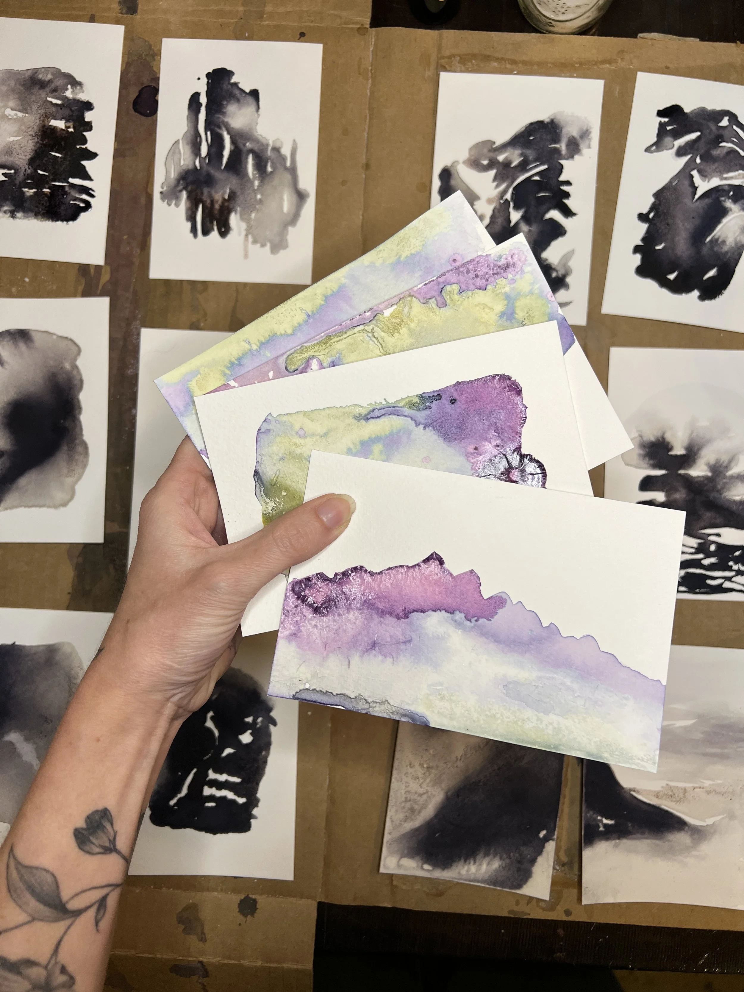Natural inks may change over time or with exposure to sunlight. This is part of my artistic process. The work is meant to be a reflection of living in the moment. Pieces are created on cotton watercolor paper, which is prone to buckling with natural inks. Some cards are created with mordants like pickling salt and baking soda and may have a raised or crystalized texture. Each set is unique. Designs on the sets shipped may differ from what is pictured below.